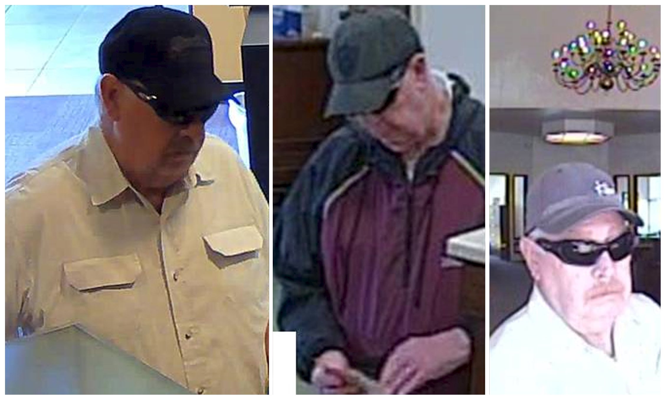 Photos from the robberies show what appears to be an older white man with a mustache who wears a baseball cap or straw hat and dark glasses.